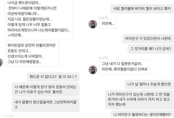 한 여성은 메시지를 공개했는데 황의조가 "6개월 만난 여자친구에게 논 거 다 걸렸다. 운동 집중도 안되고 신경이 너무 쓰인다. 호기심으로 시작해서 결국 이렇게 됐다” 등의 내용으로 여자친구가 아닌 다른 여성에게 연락을 취하고 있는 모습이 담겨 있기도 했습니다.