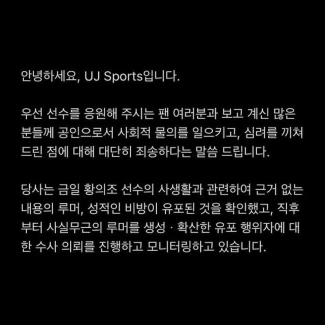 황의조 매니지먼트사 'UJ 스포츠'는 "근거 없는 루머"라며 "성적인 비방이 유포된 것을 확인했고, 직후부터 사실무근의 루머를 생성・확산한 유포 행위자에 대한 수사 의뢰를 진행하고 모니터링하고 있다"라고 입장을 밝혔습니다.