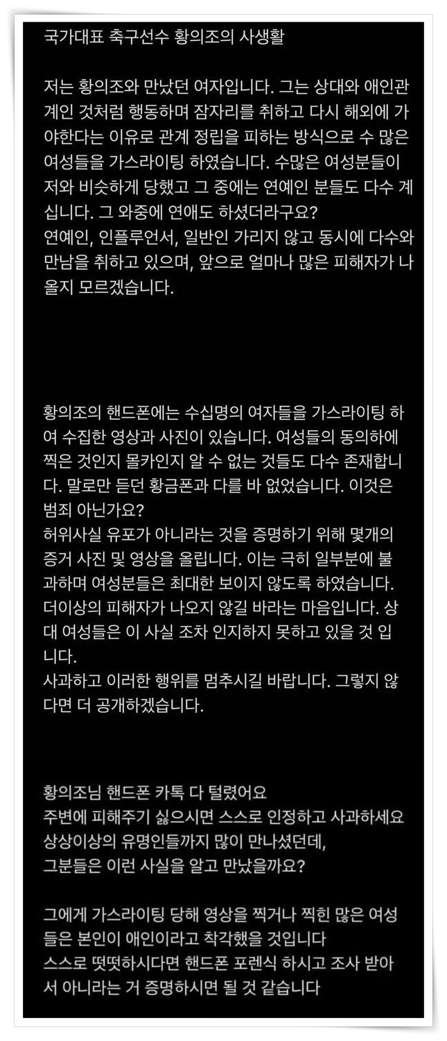 그리고 황의조 사생활 관련 폭로 글을 보면 여러 명의 여자와 관계를 맺었다고 합니다.