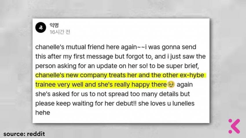 샤넬 친구로 보이는 한 네티즌은 해외 사이트에 "하이브 오디션 출신이 한 명 더 있다" "샤넬은 회사의 처우에 만족한다" 등 관련 단서를 암시하는 글을 게시하기도 했습니다.