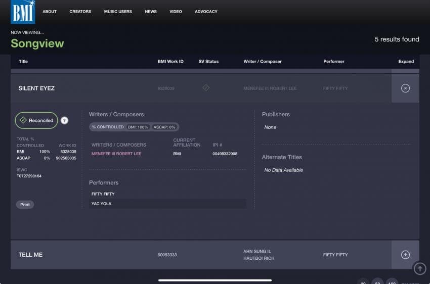 이 두 노래는 이후 BMI에서 제외됐는지 저작권협회에서 숨김 처리했다는 의혹도 나오고 있습니다.