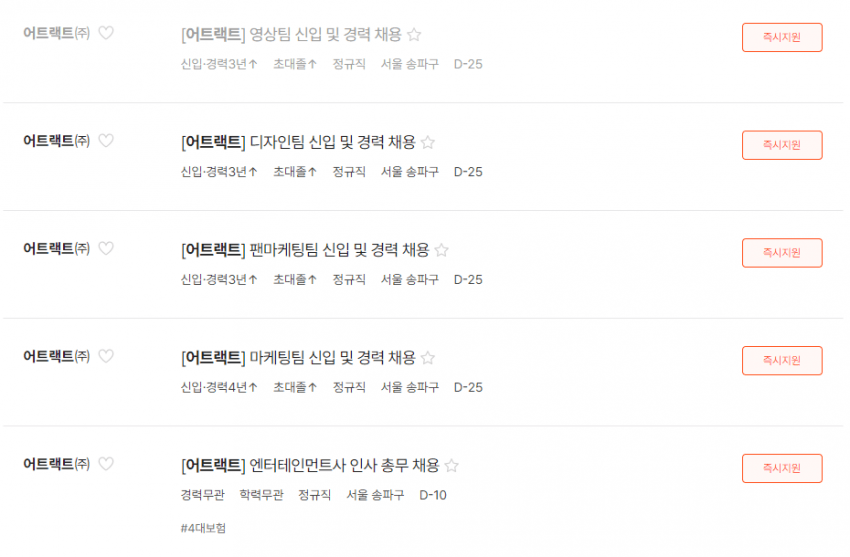 어트랙트는 최근 영상팀, 디자인팀, 마케팅팀, 팬마케팅팀, 인사총무 등 여러 분야에 걸쳐 대규모 채용을 진행 중에 있습니다.
