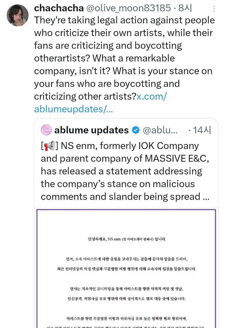 또 다른 네티즌은 "그들은 자기 아티스트를 비판하는 사람들에 대해 법적 조치를 취하고 있는데, 팬들은 다른 아티스트를 비판하고 보이콧하고 다니나요? 정말 놀라운 회사죠, 그렇죠? 다른 아티스트를 보이콧하고 비판하는 팬들에 대한 입장은 무엇인가요?"라고 반문했습니다.