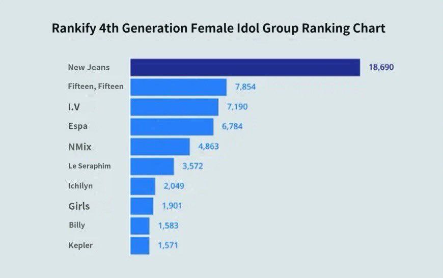 먼저, 뉴진스가 선두를 달리고 있다. 뉴진스는 4세대 여자 아이돌 그룹 내 18,690포인트를 기록해 1위로 꼽혔다.