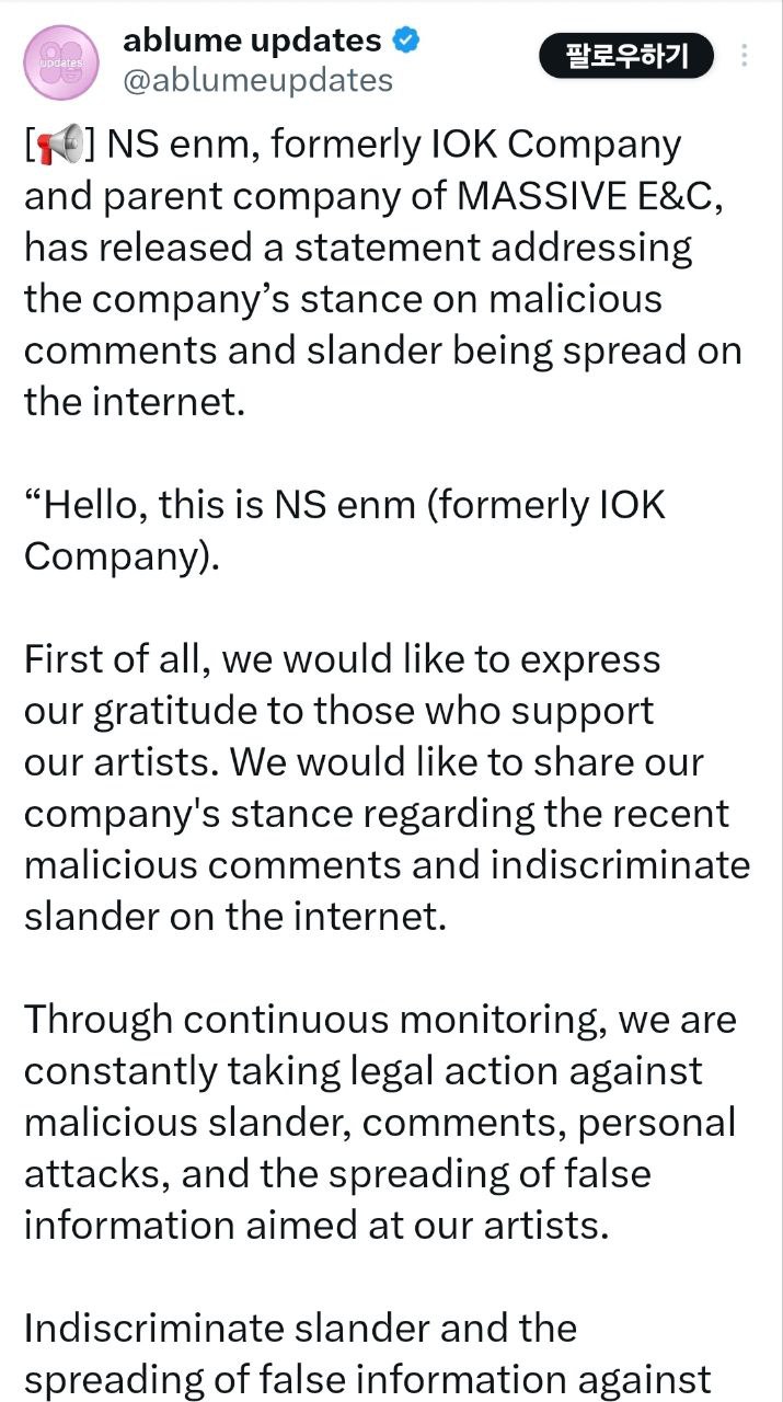 쓰리정 관련 어블룸 업데이트 계정은 21일 "과거 IOK였고 매시브이엔씨 모회사 NS ENM은 인터넷에 유포되고 있는 악의적 댓글과 중상 모략에 대한 입장을 담은 성명을 발표했다"면서 "당사는 지속적인 모니터링을 통해 악의적인 비방, 인신공격, 허위사실 유포 등에 법적 조치를 취하고 있다. 아티스트에 대한 무차별적 비방과 허위사실 유포는 명백한 범죄행위는 선처없이 대응할 계획이다. 악의적인 비방은 삼가하고 인간으로서 존엄을 존중하기를 부탁드린다"라고 했습니다.