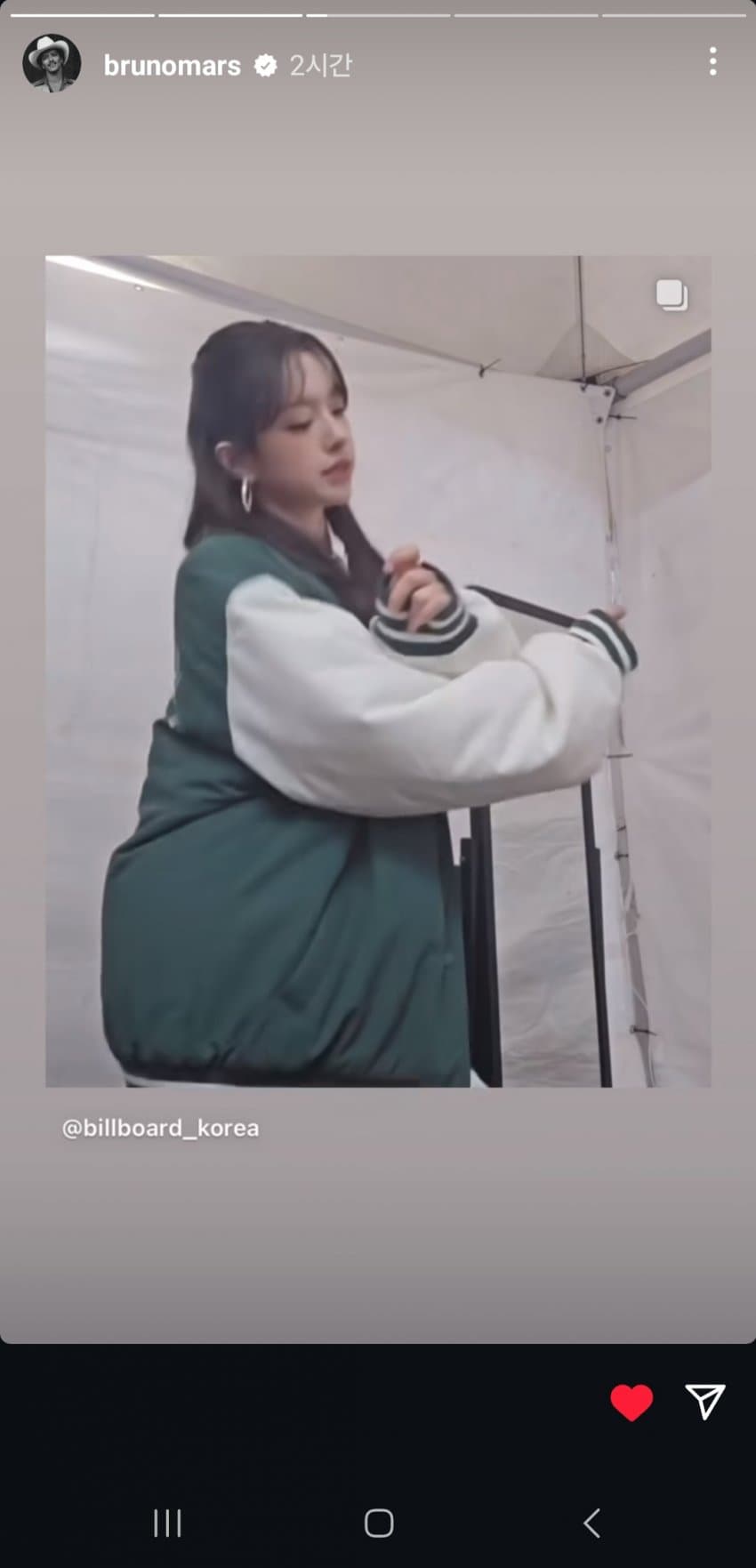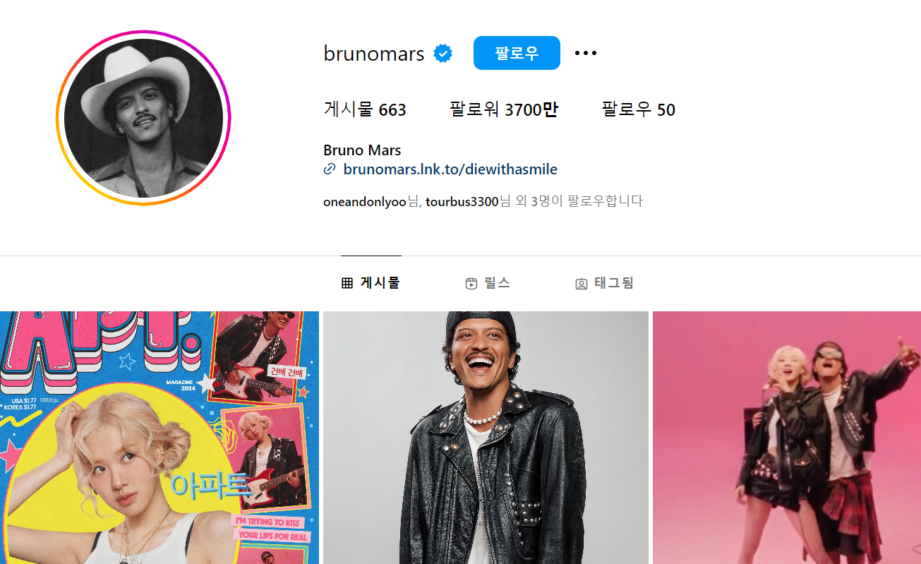 빌보드 코리아는 인스타그램에 K팝 가수들의 '아파트' 챌린지 모음으로 4개를 올렸는데 우연히 부르노마스가 그것을 유심히 보게 됐습니다.