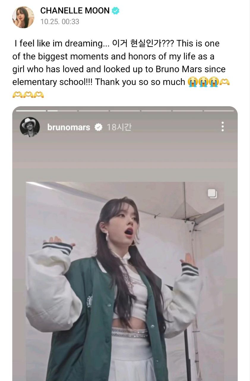 문샤넬은 오늘 25일 새벽 "꿈을 꾸고 있는 것 같아요... 이거 현실인가??? 초등학교 때부터 브루노 마스를 사랑하고 존경해 온 소녀로서 제 인생에서 가장 큰 순간이자 영광 중 하나"라고 감격해 했습니다.