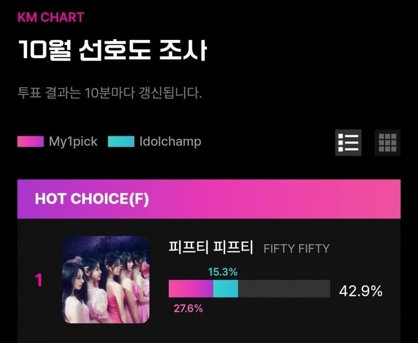 피프티는 아챔 30.61% 그리고 마이원픽 55% 투표율로 종합 합산 42.9%로 KM차트 10월 인기 선호도 투표 결과 1위에 올랐습니다.