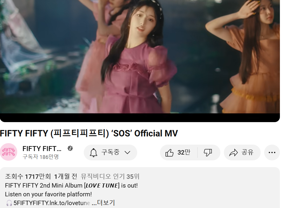 피프티 피프티 공식 유튜브 기준 만으로도 음원, 뮤직비디오, 쇼케이스 등을 합치면 1000만을 넘었습니다.