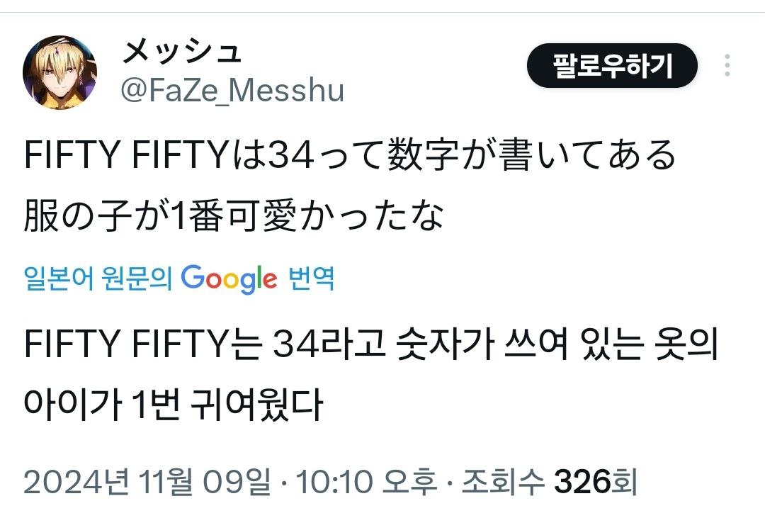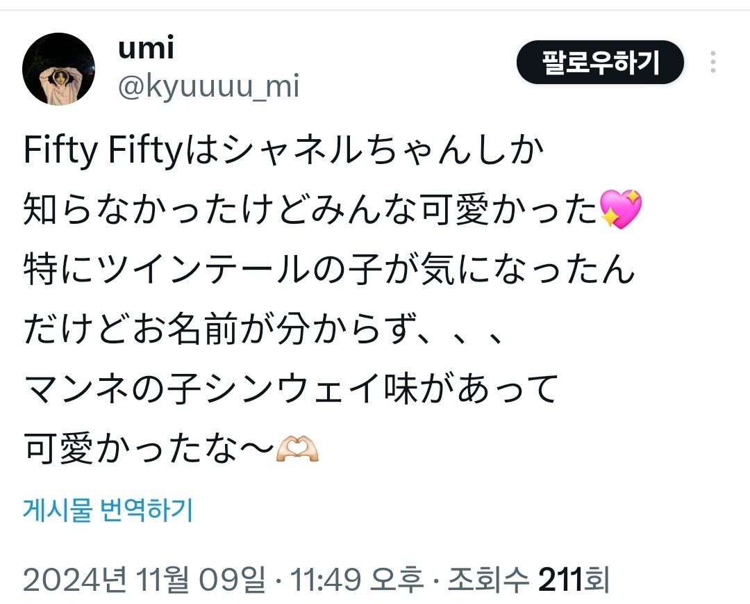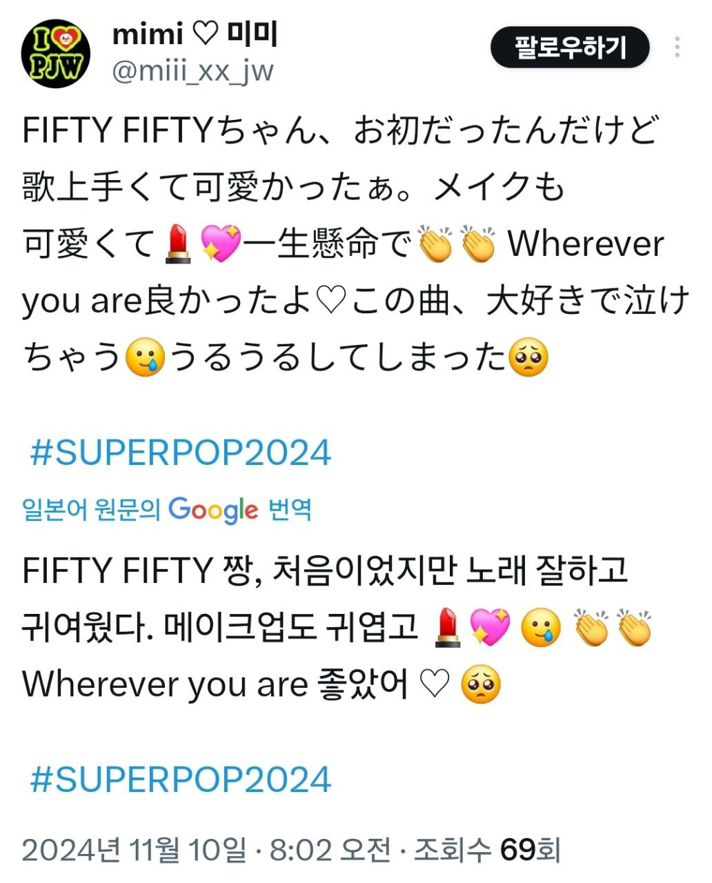 "피프티 피프티 짱, 처음이었지만 노래 잘하고 귀여웠다. 메이크업도 귀엽고, '웨어레버 유 아(Wherever you are)' 좋았어!"
