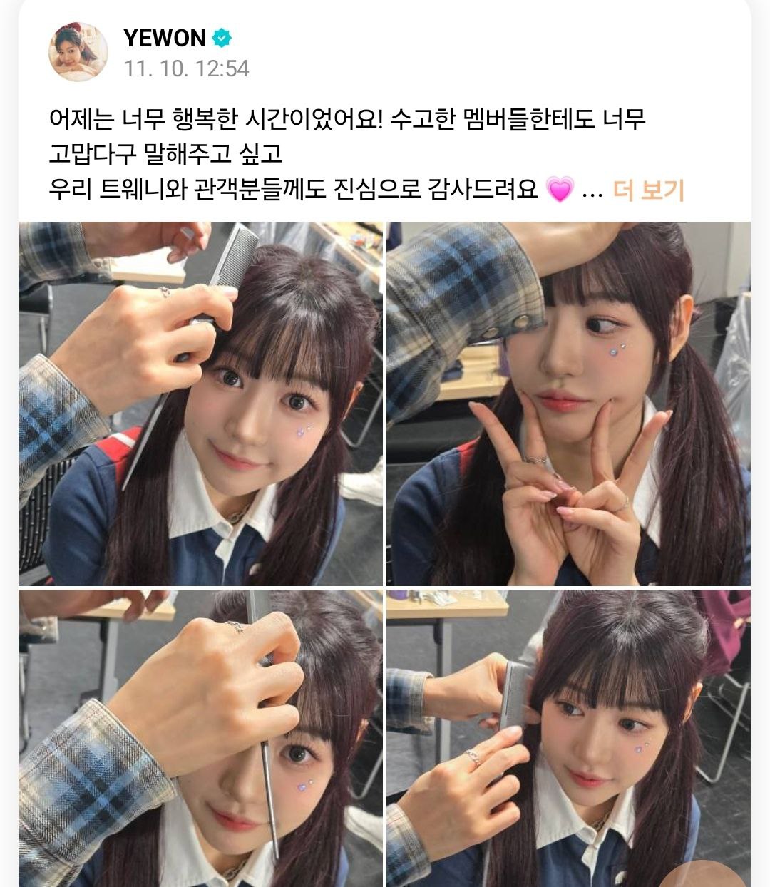예원은 위버스 커뮤니티에 "어제는 너무 행복한 시간이었어요! 수고한 멤버들한테도 너무 고맙다구 말해주고 싶고 우리 트웨니와 관객분들께도 진심으로 감사드려요 💗 앞으로 더 성장하는 모습 보여드릴게요"라고 일본 '슈퍼팝' 콘서트 관련 감사를 표했습니다.