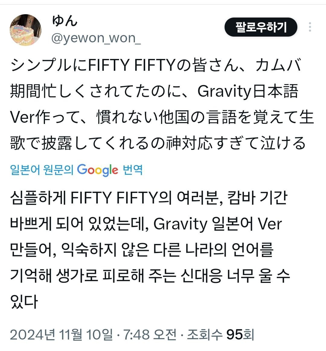 "피프티 피프티, 바쁜 상황에도 그래비티 일본어 버전 만들어 익숙하지 않은 다른 나라 언어로 기억해 라이브로 노래해주어 감동이다"