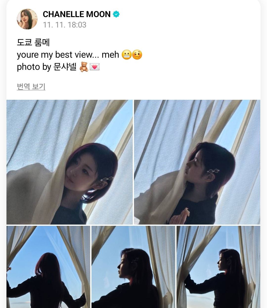 문샤넬은 위버스 커뮤니티에서 "도쿄 룸메. 유아 마이 베스트 뷰"라며 자신이 찍은 예원 사진을 공개했습니다.