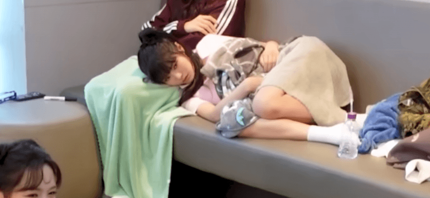 키나는 쇼파에서 누워있었으나 잠들지 못하고 실눈을 뜨고 있어 웃음을 자아냈습니다.