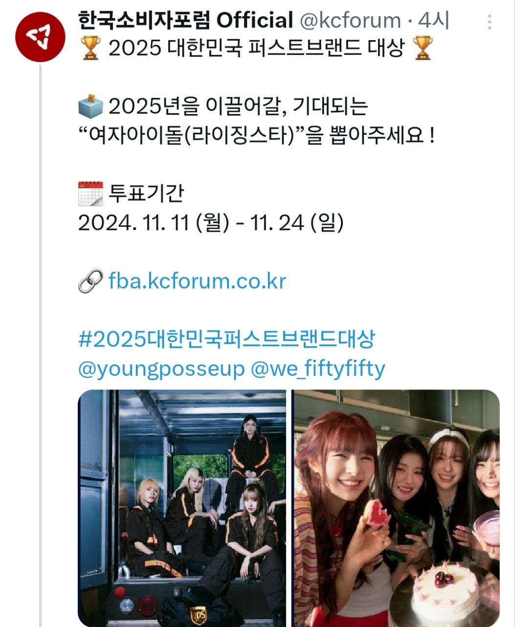 한국소비자포럼에서 주최하는 '2025 대한민국 퍼스트브랜드대상' 조사가 진행 중인데 '2025년을 이끌어갈, 기대되는 '여자아이돌 (라이징스타)' 항목에 피프티 피프티가 있으니 꼭 투표해 새해 선물을 주었으면 합니다.