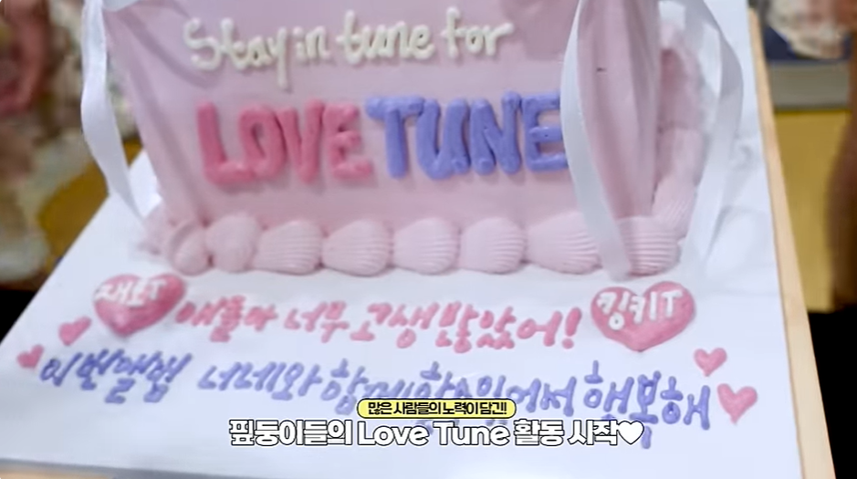 케잌에는 "Stay in tune for Love Tune. 애들이 너무 고생많았어! 이번 앨범 너네와 함께 할 수 있어서 행복해"라고 글자가 적혀 있었습니다.