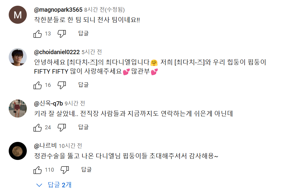최다니엘은 영상에 댓글로 "안녕하세요 [최다치-즈]의 최다니엘입니다🤗 저희 [최다치-즈]와 우리 힙둥이 핍둥이 피프티 피프티(FIFTY FIFTY) 많이 사랑해주세요💕많관부💕"라고 응원 글을 올리기도 했습니다.