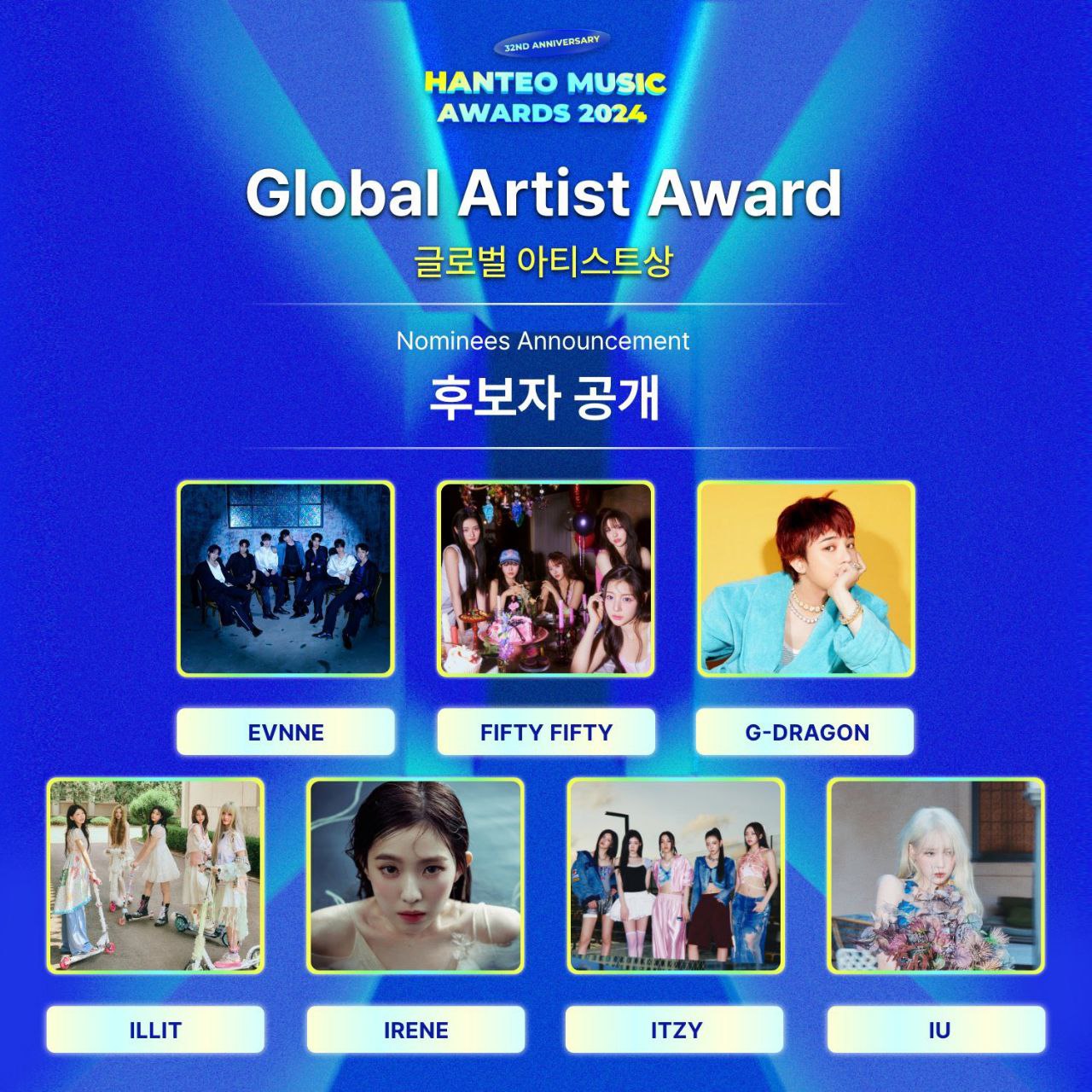 글로벌 아티스트상(GLOBAL ARTIST AWARD) 후보에는 피프티피프티를 비롯 (여자)아이들, 에스파, 에이티즈, 베이비몬스터, 백현, 보이넥스트도어, 차은우, 데이식스, 도영, 엔하이픈, 지드래곤(G-DRAGON), 이븐(EVNNE), 아일릿(ILLIT), 아이린(IRENE), 있지(ITZY), 아이유(IU) , 아이브, 제이홉, 재현, 제니, 지민, 진, 르세라핌, 미야오, 엔플라잉, NCT 127, 엔시티 드림, 뉴진스, 플레이브, QWER, 레드벨벳, 라이즈, 로제, 스트레이키즈, 태연, 더보이즈, 투모로우바이투게더, 트와이스, 투어스, 제로베이스원 등이 들었습니다.