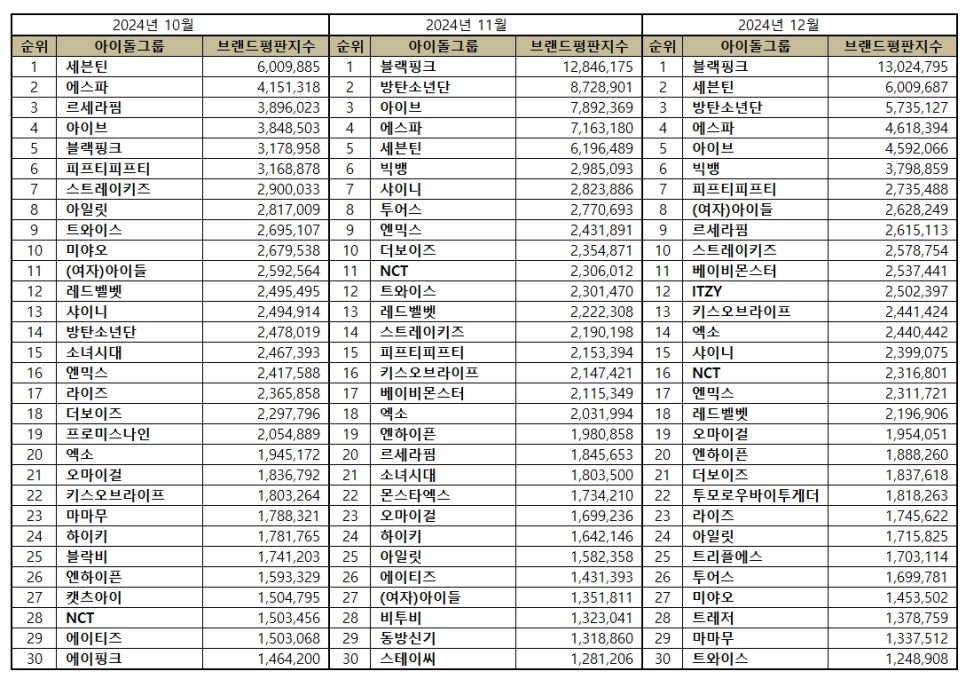 2024년 12월 가수 브랜드평판 30위 순위는 블랙핑크, 세븐틴, 임영웅, 에스파, 방탄소년단, 빅뱅, 아이브, 데이식스, 투어스, 비비, QWER, 피프티피프티, 박진영, (여자)아이들, 태연, NCT, 이찬원, 트와이스, 아이유, 이영지, 조용필, 베이비몬스터, 아일릿, 송가인, 영탁, 강다니엘, 레드벨벳, ITZY, 화사, 엑소 순으로 분석됐습니다.