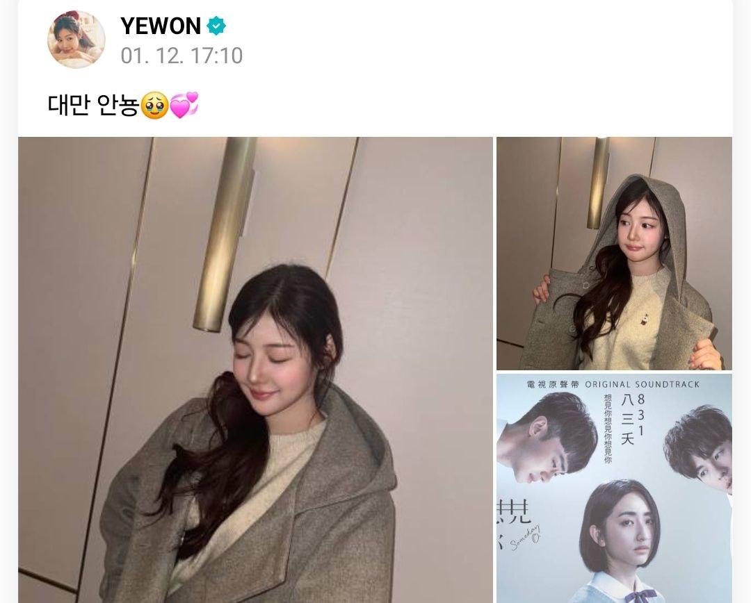 예원은 "대만 안뇽"이라고 사진을 올렸습니다.