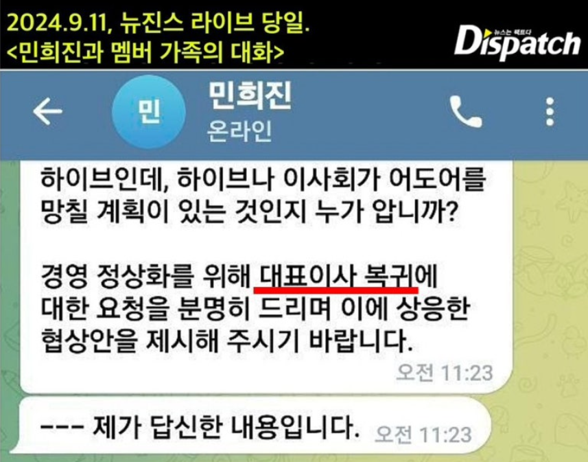 한편, 한 매체는 "뉴진스와 민희진, 세종은 오랫동안 소통을 이어갔다. 하이브 및 어도어 관련 주요 이슈를 공동으로 대응했다. 일례로, 민희진 대표 복귀 요청 및 하니 국감 출석 등을 함께 논의하기도 했다."라고 사진 증거를 공개했습니다.