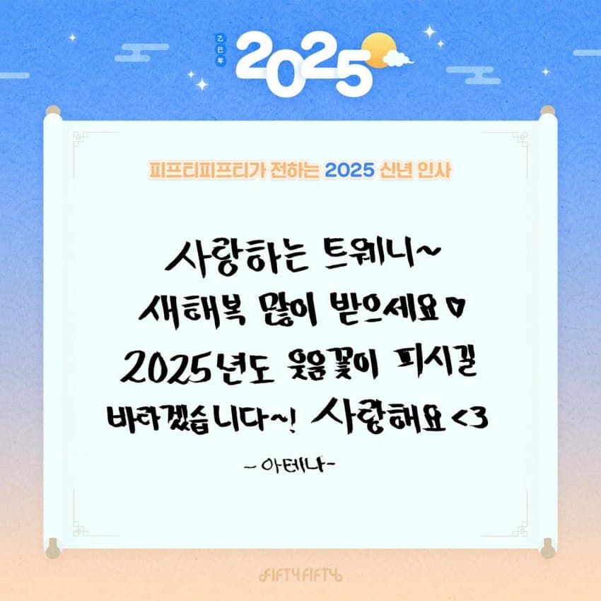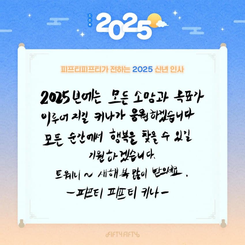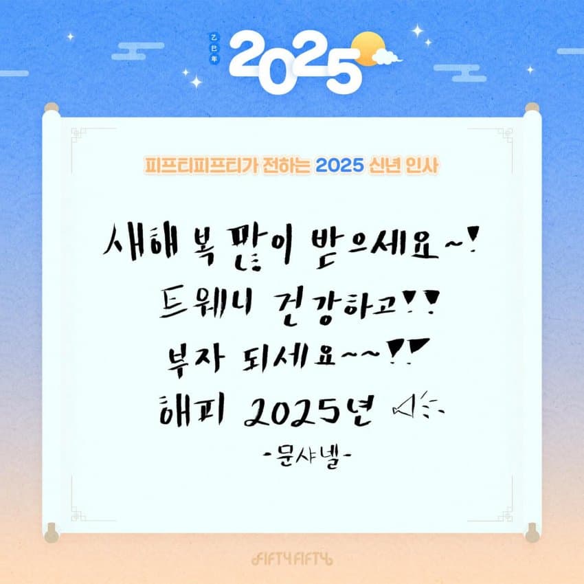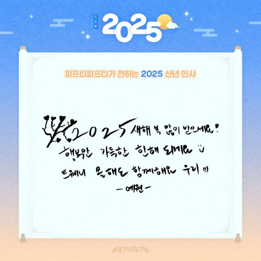 다섯 멤버들은 영상을 통해 "드디어 2025년 푸른 뱀의 해가 밝았습니다. 2024년은 피프티피프티가 러브튠 앨범, 윈터 글로우 앨범, 그리고 미주 투어를 통해 우리 트웨니(TWENY)들과 만남을 가진 특별한 해 였는데요. 2025년도에도 더 좋은 음악을 들려드리고 트웨니 분들과 자주 만날 수 있도록 노력할 테니까요. 앞으로도 많은 기대와 관심 부탁드립니다"라고 인사했습니다.