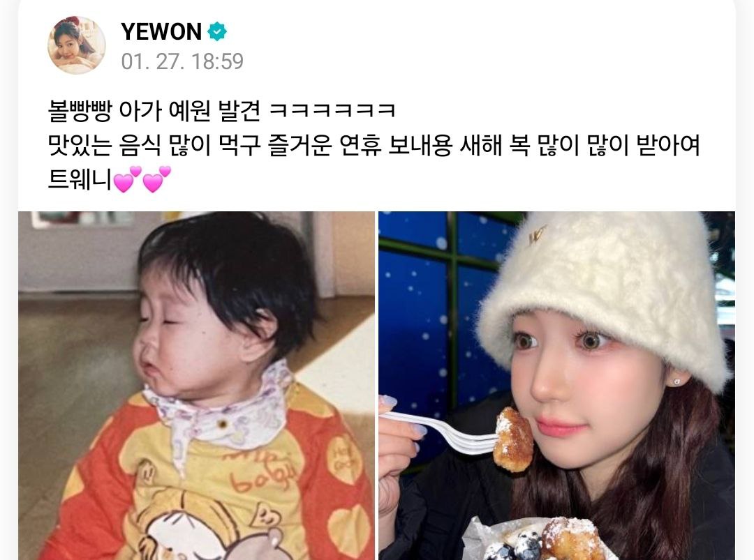 예원은 위버스 커뮤니티에 "볼빵빵 아가 예원 발견. 맛있는 음식 많이 먹구 즐거운 연휴 보내용. 새해 복 많이 많이 받아여. 트웨니(TWENy)💕💕"라는 글과 함께 아가 시절 사진을 올렸습니다.