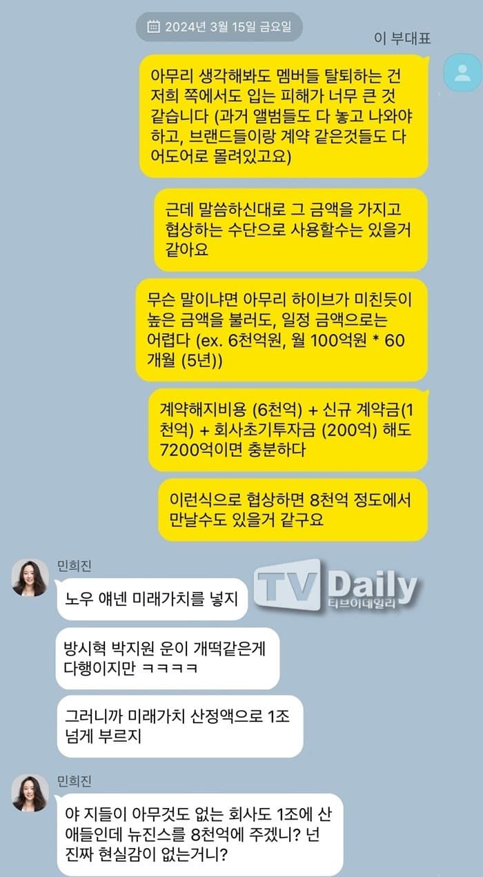 그러나 민희진의 '경영권 찬탈'을 모의한 정황 등 여러가지 상황이 문제가 되고 있습니다. 지난 4월 당시 어도어 부대표는 '2025년 1월 민희진의 풋옵션 행사→어도어 빈 껍데기→재무적 투자자 구한 뒤 하이브에 어도어 매각 권유→ 하이브가 매각 실행하는 때를 노려 어도어 지분 취득'이라는 시나리오가 담긴 카카오톡 메시지를 민희진에게 보낸 것이 드러난 바 있습니다.