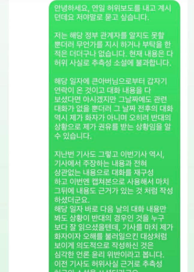 민희진은 "근거 없는 내용으로 저를 의심하고 확인도 없이 기정사실화하여 보도하는 것은 어쩔 수 없이 언론사가 하이브로부터 사주받은 것을 의심케 합니다. 그리고 반론 요청을 하실 것이 아니라 기사를 내기 전에 확인하시는 게 순서 아닙니까?"라고 했습니다.