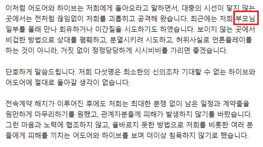 뉴진스 멤버들 입장문과 부모들 입장문에서 공통점이 '부모들' 단어 입니다.