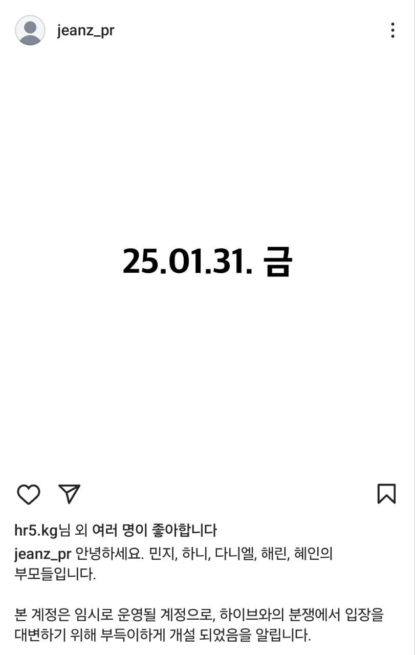 민지 하니 다니엘 해린 혜인 5명 멤버 부모들은 인스타그램에 ‘진즈_피알’(@jeanz_pr)이라는 이름의 계정을 만들었습니다.