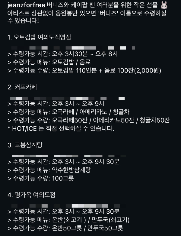 뉴진스 다섯 멤버는 작년 12월 14일 새로 개설한 인스타그램 ‘진즈포프리’(jeanszforfree)에 버니즈와 K팝 팬을 위한 작은 선물이라며 어떤 아티스트 팬이라도 상관 없이 응원봉만 있으면 먹거리를 수령할 수 있다고 '탄핵 찬성 집회' 참여자에 선결제 음식 제공을 공지했습니다.