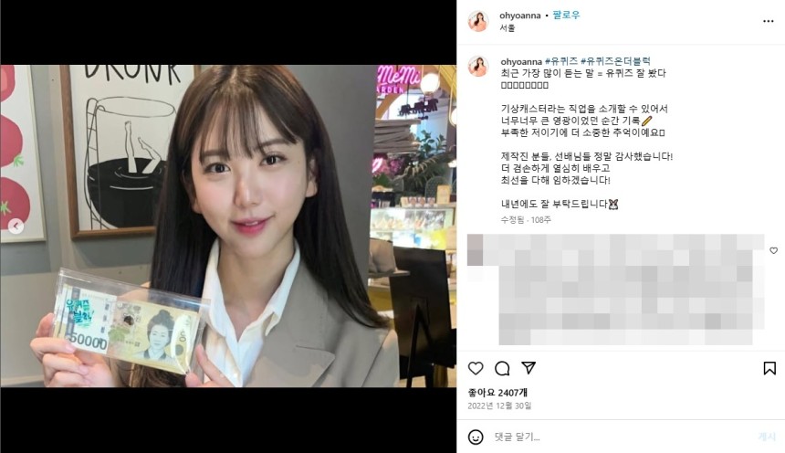 한편 오요안나는 2019년 춘향선발대회에서 숙으로 뽑힌 뒤 2021년 5월 MBC 공채 기상캐스터로 선발됐습니다.