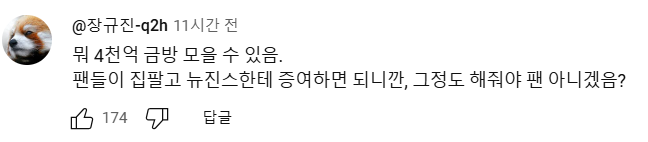 또 다른 네티즌은 "뭐 4천억 금방 모을 수 있음. 팬들이 집팔고 뉴진스한테 증여하면 되니깐, 그 정도 해줘야 팬 아니겠음?"이라고 팬덤의 문제점을 비판했습니다.