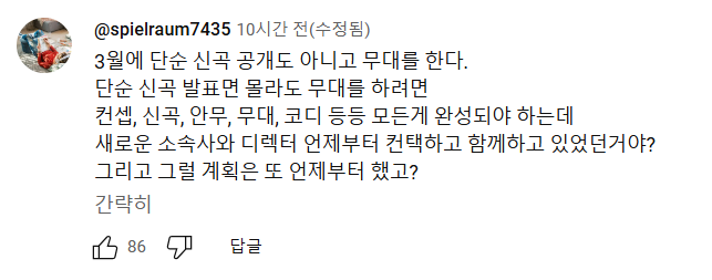 한 네티즌은 "3월에 단순 신곡 공개도 아니고 무대를 한다. 단순 신곡 발표면 몰라도 무대를 하려면 컨셉, 신곡, 안무, 무대, 코디 등등 모든게 완성되야 하는데 새로운 소속사와 디렉터 언제부터 컨택하고 함께하고 있었던거야? 그리고 그럴 계획은 또 언제부터 했고?"라는 반응을 보였습니다.