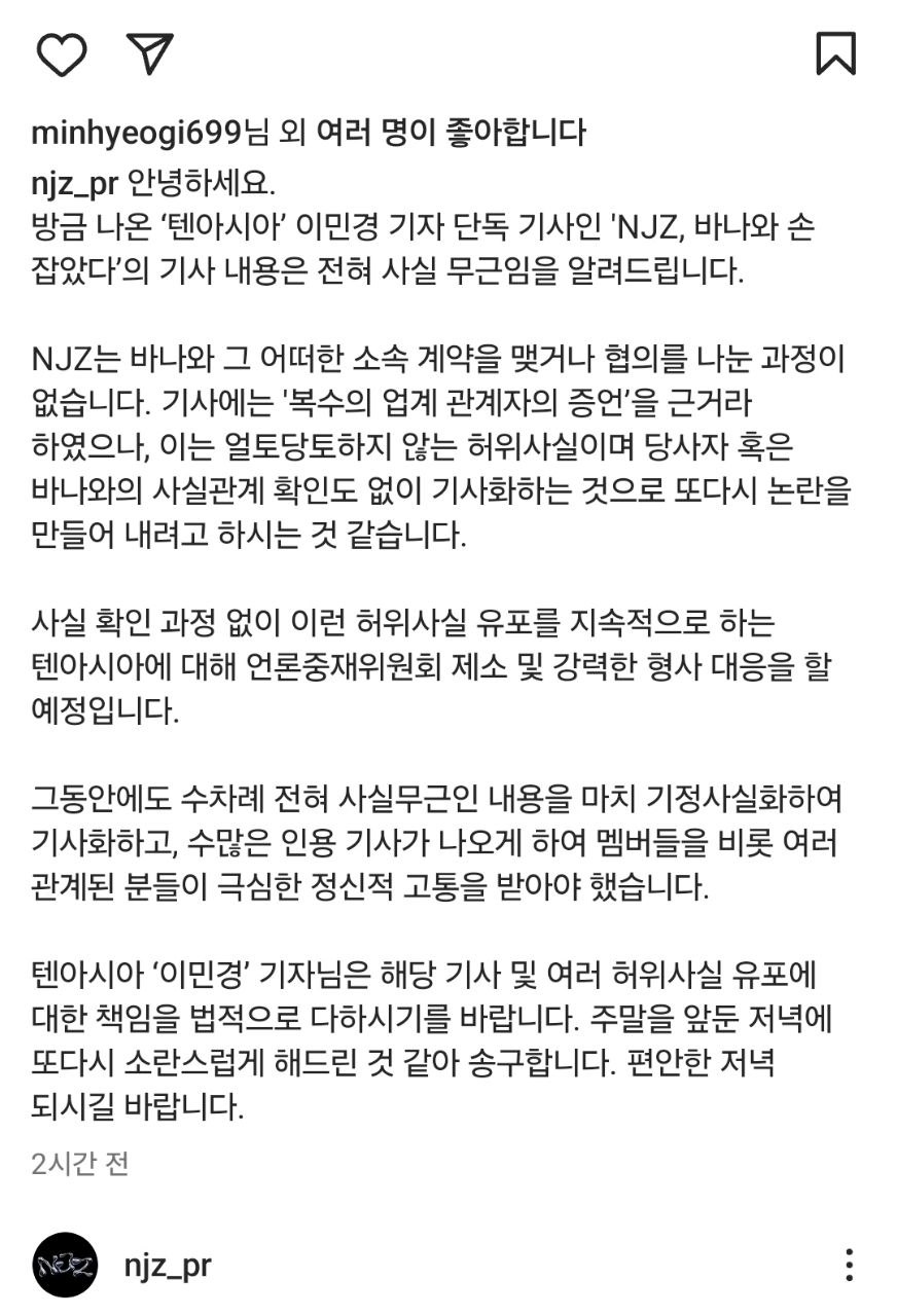 뉴진스 부모 측이 <"NJZ, 바나와 손 잡았다"…뉴진스, 어도어 떠나 다른 기획사 접촉 정황> 단독 보도에 대해 텐아시아 이민경 기자를 콕 찝어 형사 대응 등 공격을 하는 SNS에 올린 것에 대해 부적절한 대응이라는 비판이 나오고 있습니다.