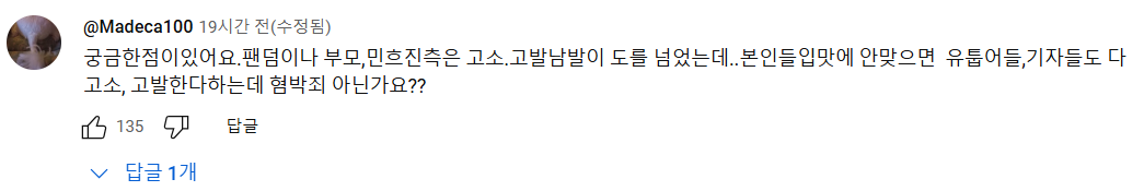 "팬덤이나 부모, 민희진 측은 고소. 고발 남발이 도를 넘었는데...본인들 입맛에 안맞으면 유튜버들, 기자들도 다 고소, 고발한다하는데 혐박죄 아닌가요?"