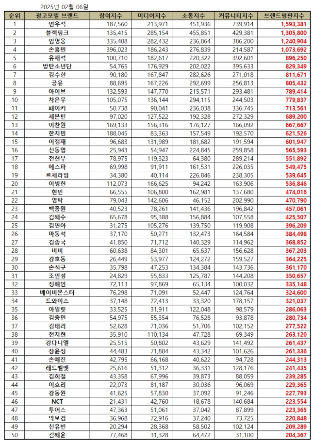 2025년 2월 광고모델 브랜드평판조사에서 1위 변우석, 2위 블랙핑크, 3위 임영웅, 4위 손흥민, 5위 유재석, 6위 방탄소년단, 7위 김수현, 8위 공유, 9위 아이브, 10위 차은우 순으로 나타났습니다.