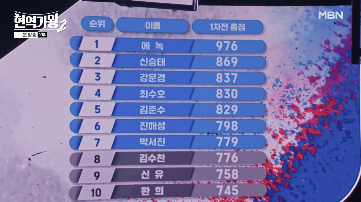 그리고 6위 진해성 (798점), 7위 박서진 (779점), 8위 김수찬 (776점), 9위 신유 (758점), 10위 환희 (745점는 하위권에 속했습니다.