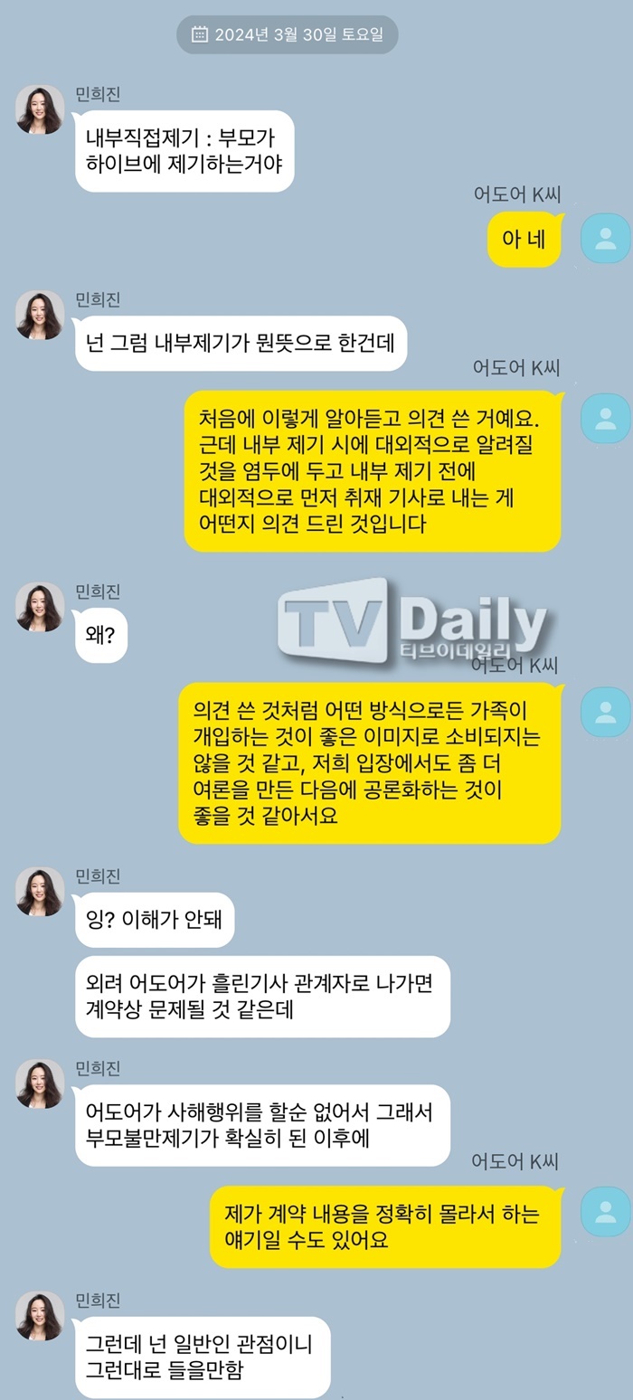 티브이데일리는 당시 어도어 민희진 대표와 이상우 부대표, 어도어 핵심 경영진들이 나눈 문자 내역을 입수해 그대로 재구성했습니다.
