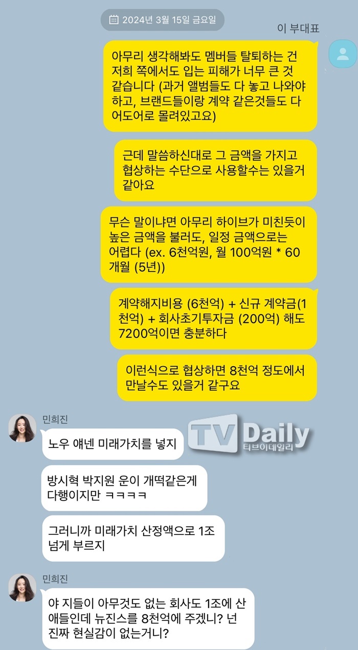 뉴진스와 전속계약 해지 시 예상되는 최대 6천억원의 손해배상액을 구체적으로 계산한 대화였습니다.