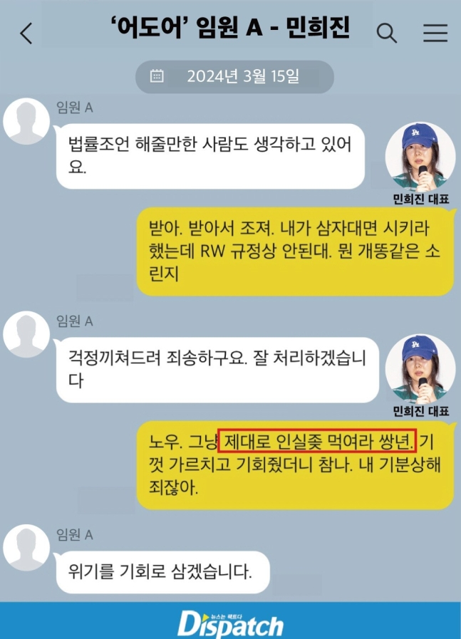 “짜깁기한 대화록이다. 손해배상금 추산은 어도어의 기업가치 산정하는 대강의 방식이었을 뿐, 이 대화는 오히려 민 대표 역시 멤버들의 탈퇴를 우려했다는 반증이다. 어도어와 뉴진스 간 전속계약을 해지시키려는 의도 자체가 없었다.”