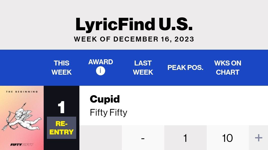 그리고 피프티피프티 '큐피드'가 이번 주 빌보드 리릭 파인드 US 1위에 재진입하면서 새롭게 최고 순위에 등극했습니다.