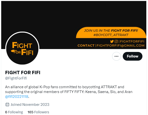 '파이트 포 피피' 계정은 키나를 응원하는 피프티피프티 팬들 관련 엑스 계정은 모두 차단했습니다.