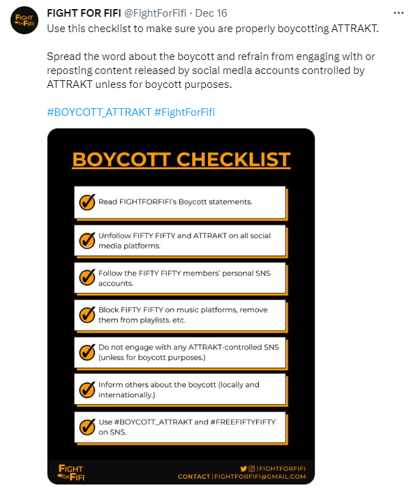 과거 어트랙트에 대한 보이콧이 해외 피프티 팬들 연합, 즉 허니즈유나이티드라고 했는데 이제는 K팝 팬들이라고 하고 있습니다.
