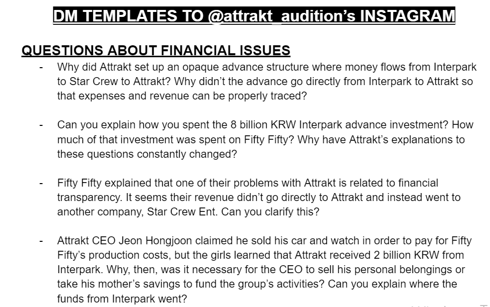 또한 안성일과 삼푼이 일당이 황당한 것은 적반하장으로 "왜 어트랙트는 멤버들을 상대로 광범위한 비방 캠페인을 벌였을까요? 왜 어트랙트는 2023년 7월에 허니즈의 온라인 악성 댓글로부터 피프티피프티를 보호해달라는 요청에 응답하지 않았을까요? 왜 어트랙트는 그 그룹을 지지하기 위해 비영리 상품을 만들었다는 이유로 미국 팬들을 상대로 소송을 제기하겠다고 협박하는 데 관심을 집중했을까요?"라고 질문 예시를 제시하기도 했습니다.