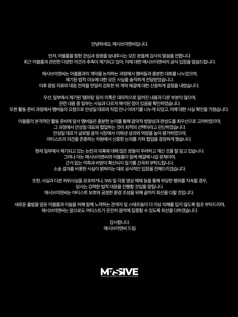 소속사 매시브이엔씨도 공식 입장문을 통해 “‘템퍼링’ 등 의혹은 대외적으로 알려진 내용과 다른 부분이 많다”며 “소송 결과를 비롯한 사실이 밝혀지는 대로 입장을 전할 것”이라고 밝혔습니다.