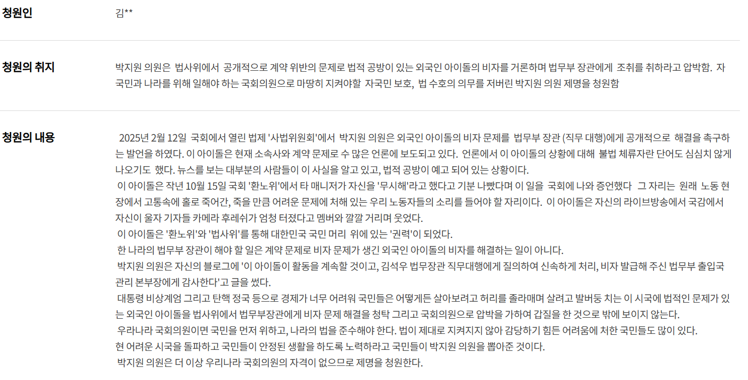 노동자인 청원인 김 모씨는 "아이돌을 법사위에서 법무부장관에게 비자 문제 해결을 청탁 그리고 국회의원으로 압박을 가하여 갑질을 한 것으로 밖에 보이지 않는다"며