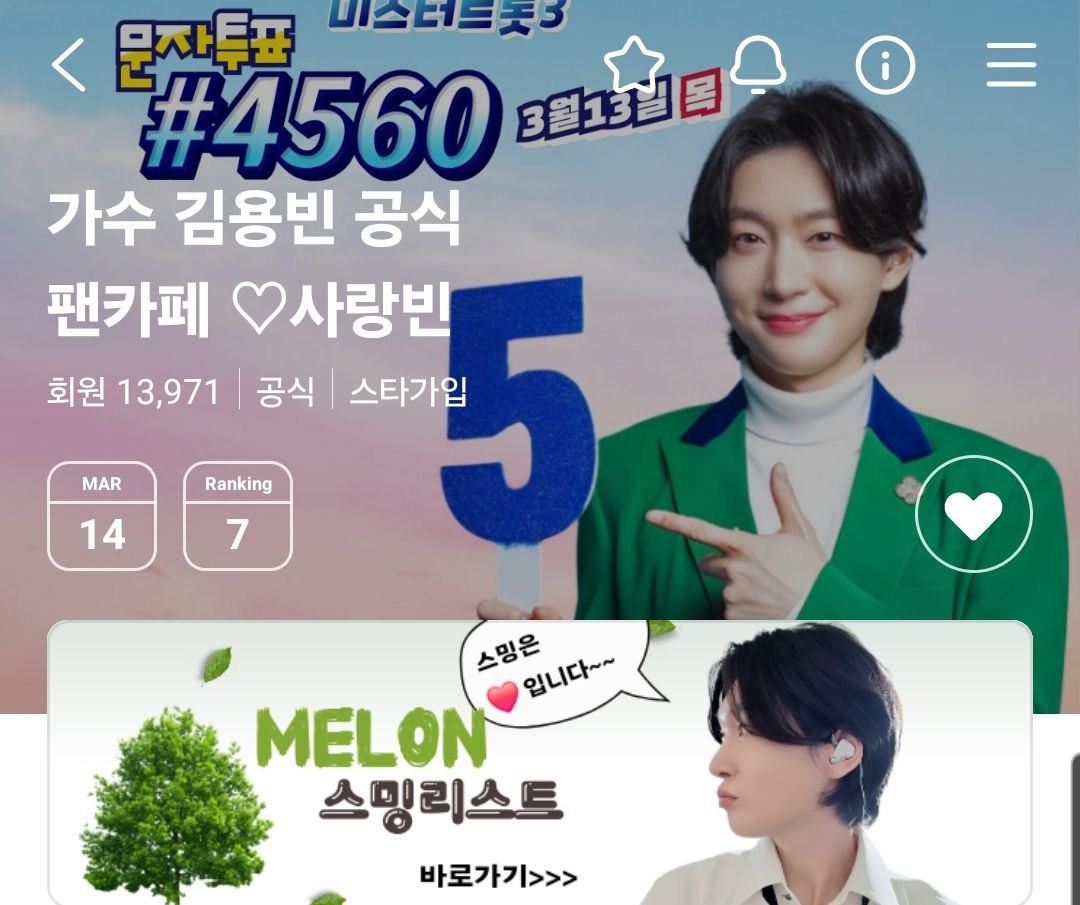 앞서 김용빈은 지난 2일 자신의 인스타그램을 통해 “감사하고 또 감사하다. 사랑합니다”라며 팬카페 ‘사랑빈’의 회원 수 1만명 돌파를 자축했습니다.