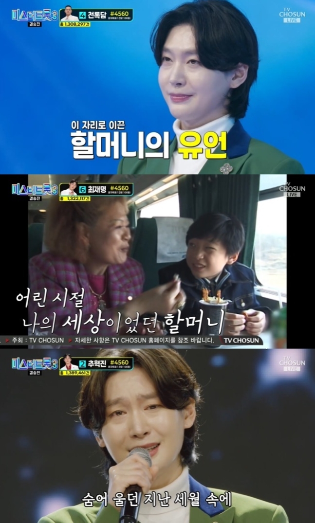 돌아가신 할머니의 유언으로 ‘미스터트롯3’에 참가한 김용빈은 결승을 앞두고 방문한 고향에서 고모와 대화를 나누다 할머니를 떠올렸습니다.